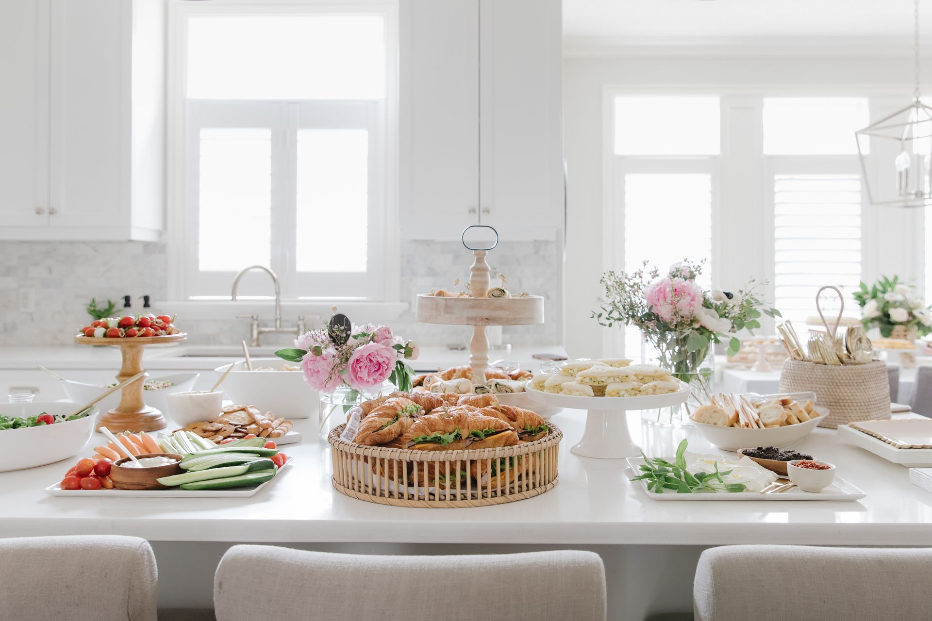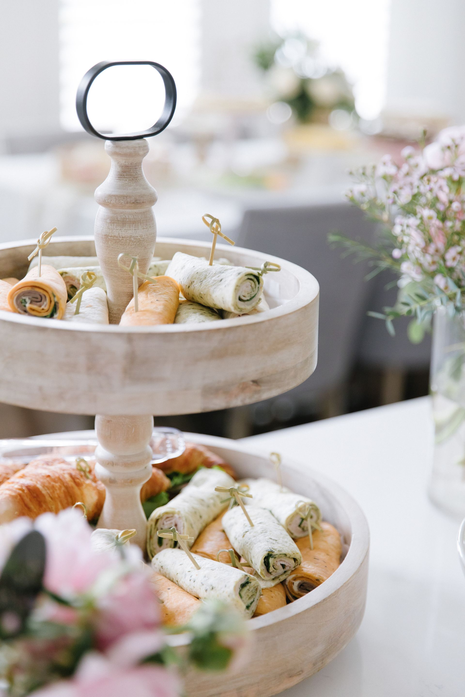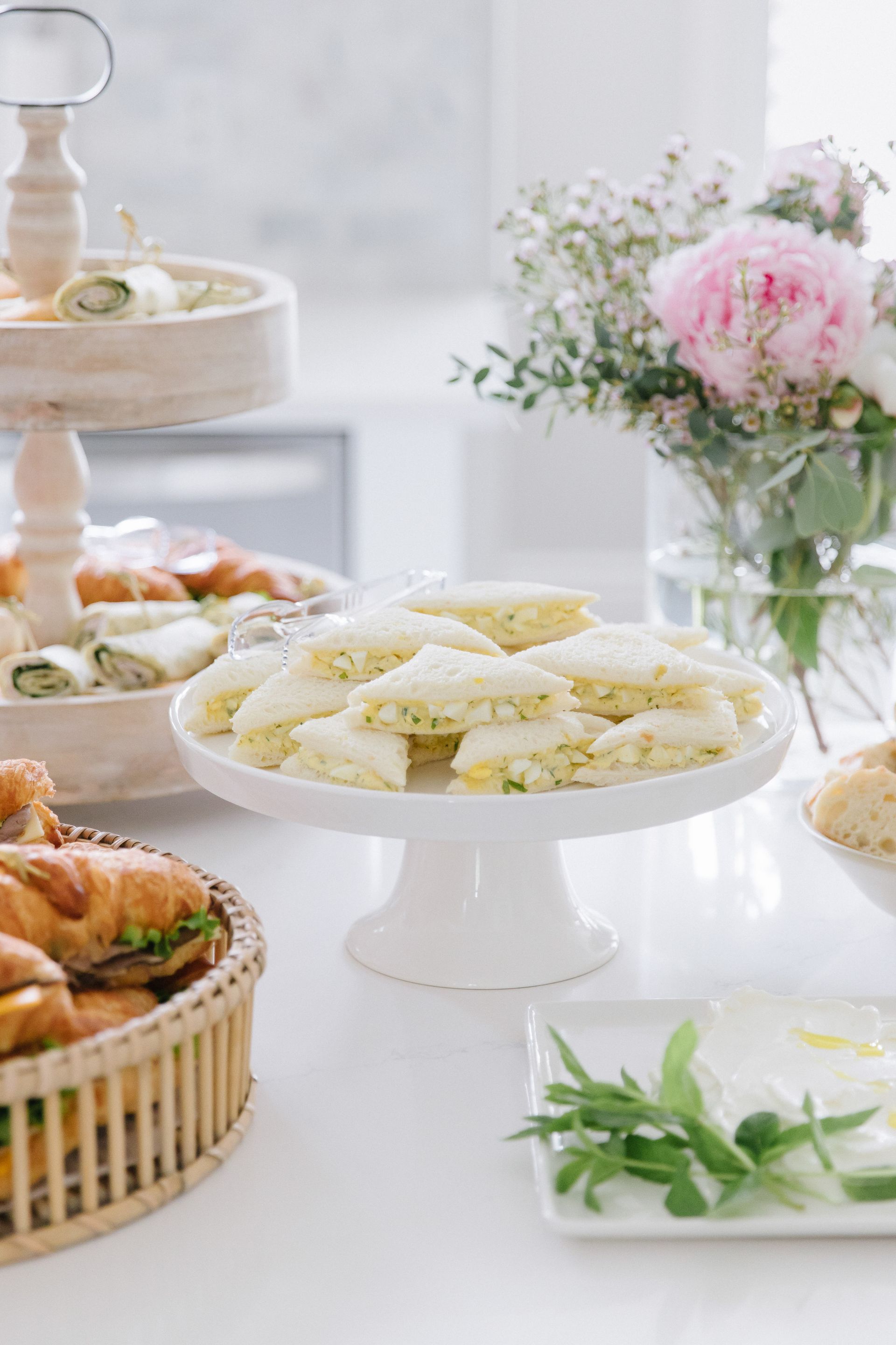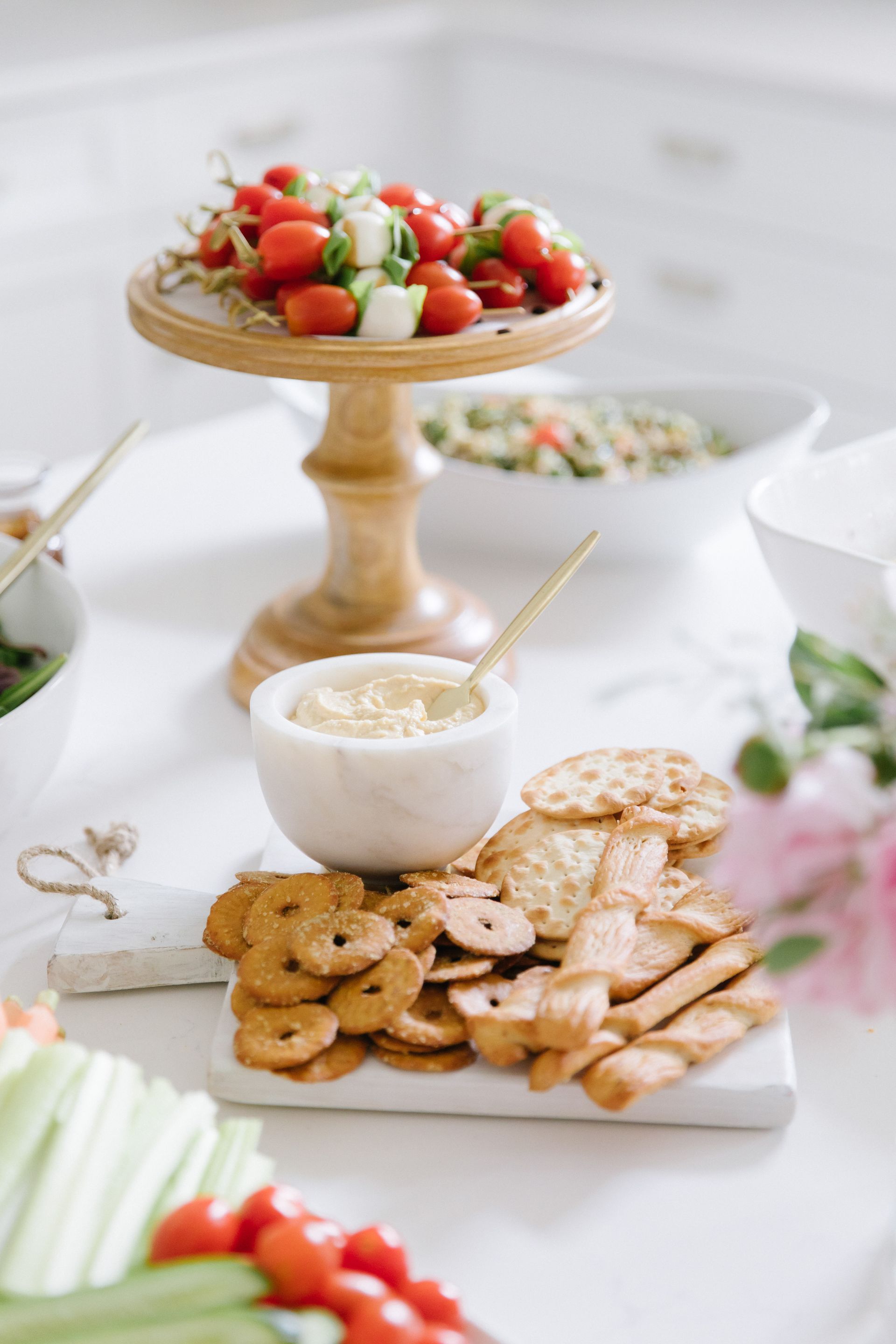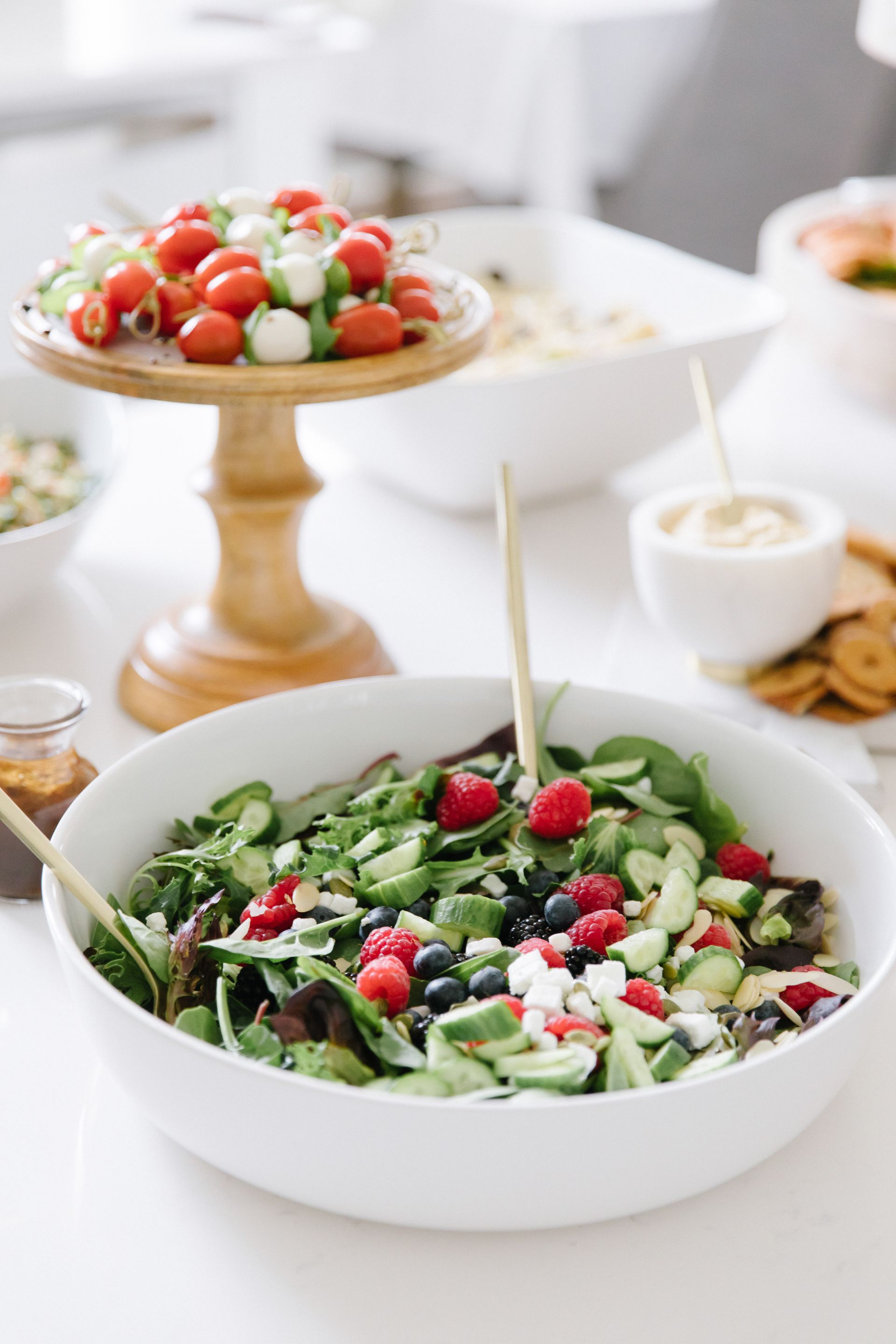 The lunch menu included easy make ahead options such as: croissant and egg salad sandwiches, roast beef and turkey wraps, a berry vinaigrette spring summer salad, veggies and dip, tomato basil skewers, pasta salad , quinoa salad, hummus, labneh and a olive tapenade.